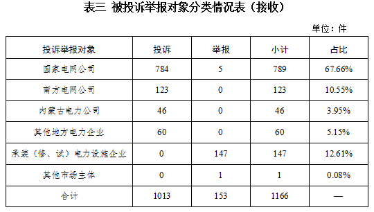 供電企業(yè)1018件、占投訴舉報(bào)總數(shù)的87.31%,其中國(guó)家電網(wǎng)公司789件、占投訴舉報(bào)總數(shù)的67.66%,南方電網(wǎng)公司123件、占投訴舉報(bào)總數(shù)的10.55%,內(nèi)蒙古電力公司46件、占投訴舉報(bào)總數(shù)的3.95%,其他地方電力企業(yè)60件、占投訴舉報(bào)總數(shù)的5.15%;承裝(修、試)電力設(shè)施企業(yè)147件、占投訴舉報(bào)總數(shù)的12.61%;其他市場(chǎng)主體1件、占投訴舉報(bào)總數(shù)的0.08%。