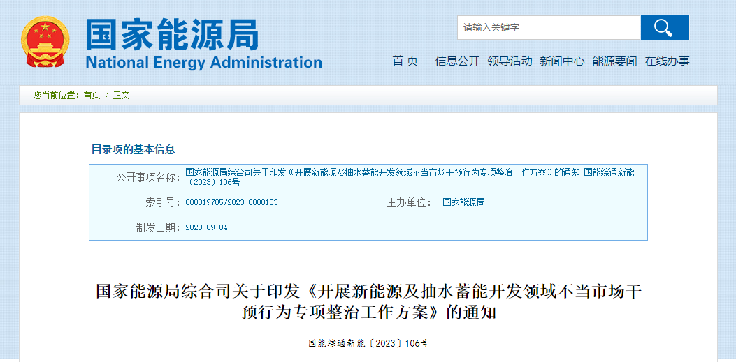 國家能源局綜合司關(guān)于印發(fā)《開展新能源及抽水蓄能開發(fā)領(lǐng)域不當(dāng)市場干預(yù)行為專項整治工作方案》的通知