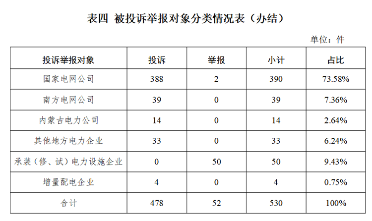 從被投訴舉報對象看,供電企業(yè)476件、占投訴舉報總數(shù)的89.82%,其中國家電網(wǎng)公司390件、占比73.58%;南方電網(wǎng)公司39件、占比7.36%;內(nèi)蒙古電力公司14件、占比2.64%;其他地方電力企業(yè)33件、占比6.24%;承裝(修、試)電力設(shè)施企業(yè)50件、占比9.43%;增量配電企業(yè)4件、占比0.75%。