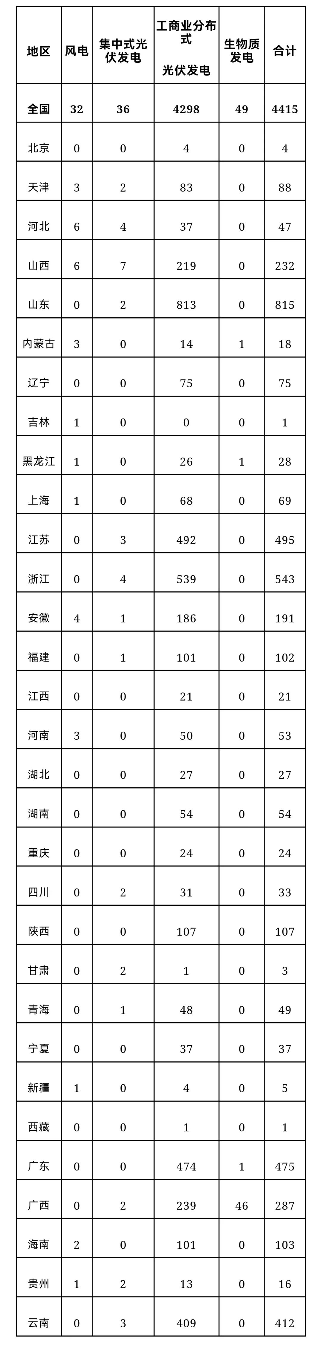 2025年4月,全國新增建檔立卡新能源發(fā)電(不含戶用光伏)項(xiàng)目共4415個(gè),其中風(fēng)電項(xiàng)目32個(gè),光伏發(fā)電項(xiàng)目4334個(gè)(集中式光伏發(fā)電項(xiàng)目36個(gè),工商業(yè)分布式光伏發(fā)電項(xiàng)目4298個(gè)),生物質(zhì)發(fā)電項(xiàng)目49個(gè)。風(fēng)電、集中式光伏發(fā)電、生物質(zhì)發(fā)電項(xiàng)目清單見附件,工商業(yè)分布式光伏發(fā)電項(xiàng)目清單詳見國家可再生能源發(fā)電項(xiàng)目信息管理平臺(tái)網(wǎng)站(網(wǎng)址https://jdlk.renewable.org.cn/card-info-sheet/)。