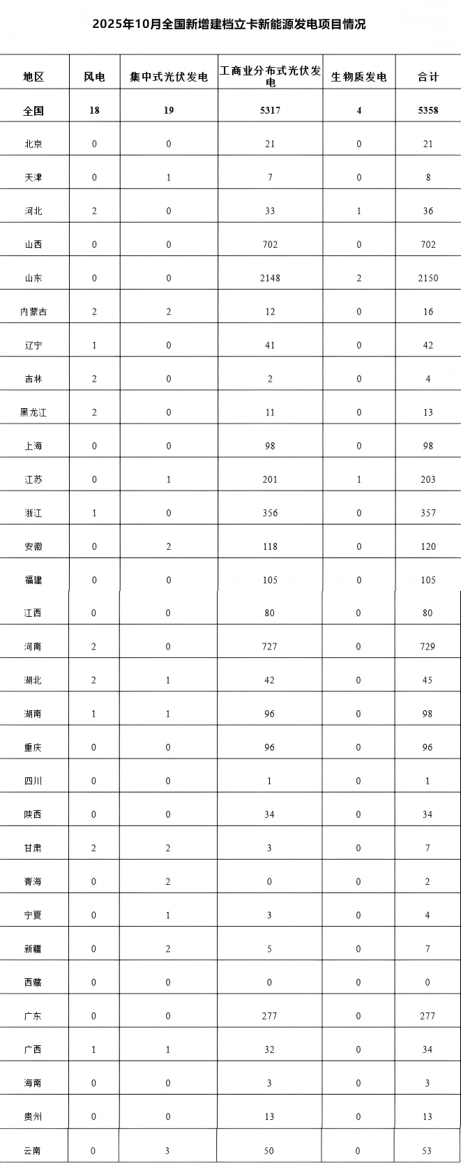 2025年10月,全國新增建檔立卡新能源發(fā)電(不含戶用光伏)項目共5358個,其中風(fēng)電項目18個,光伏發(fā)電項目5336個(集中式光伏發(fā)電項目19個,工商業(yè)分布式光伏發(fā)電項目5317個),生物質(zhì)發(fā)電項目4個。