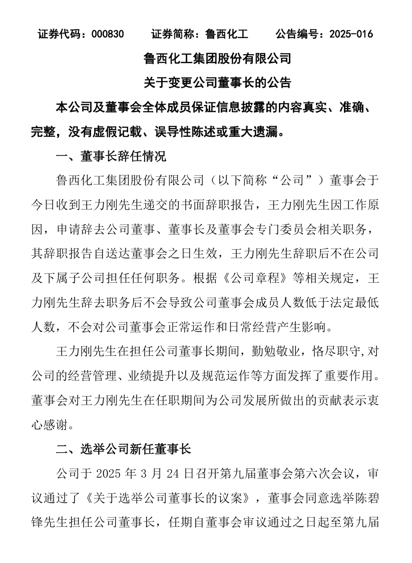 魯西化工發(fā)布公告稱(chēng),公司董事會(huì)3月24日收到王力剛先生遞交的書(shū)面辭職報(bào)告,王力剛先生因工作原因,申請(qǐng)辭去公司董事、董事長(zhǎng)及董事會(huì)專(zhuān)門(mén)委員會(huì)相關(guān)職務(wù),其辭職報(bào)告自送達(dá)董事會(huì)之日生效,王力剛先生辭職后不在公司及下屬子公司擔(dān)任任何職務(wù)。