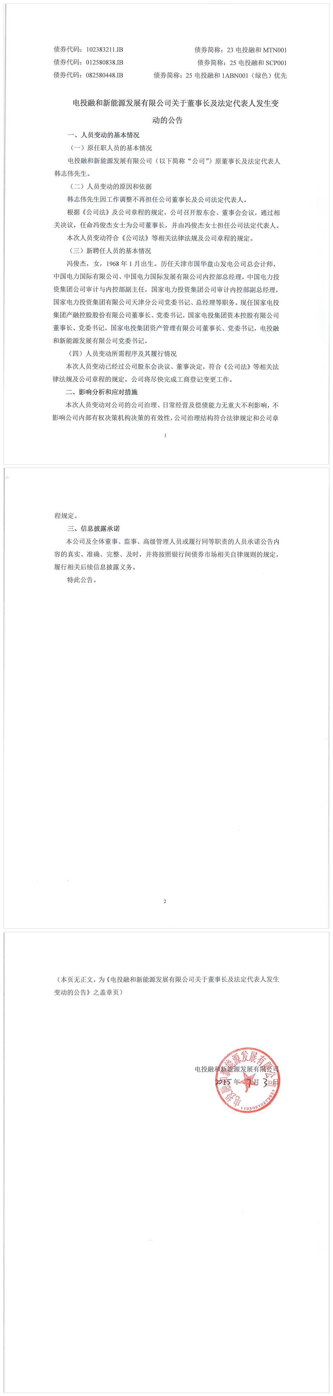 電投融和新能源發(fā)展有限公司發(fā)布公告稱(chēng),韓志偉先生因工作調(diào)整不再擔(dān)任公司董事長(zhǎng)及公司法定代表人。