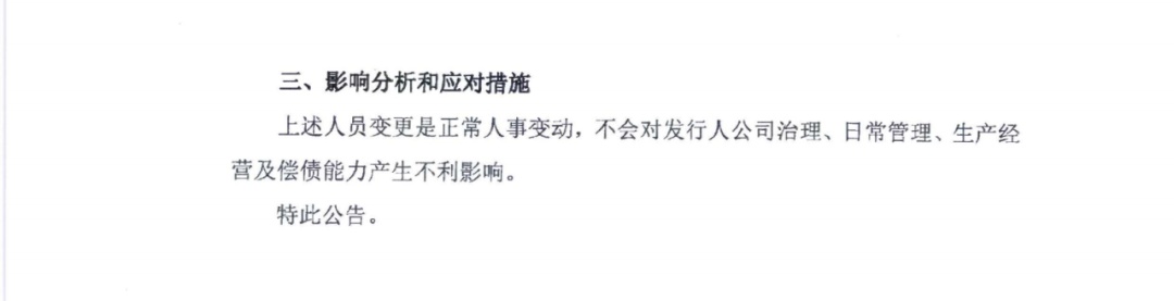 上述人員變更是正常人事變動(dòng),不會(huì)對(duì)發(fā)行人公司治理、日常管理、生產(chǎn)經(jīng)營(yíng)及償債能力產(chǎn)生不利影響。