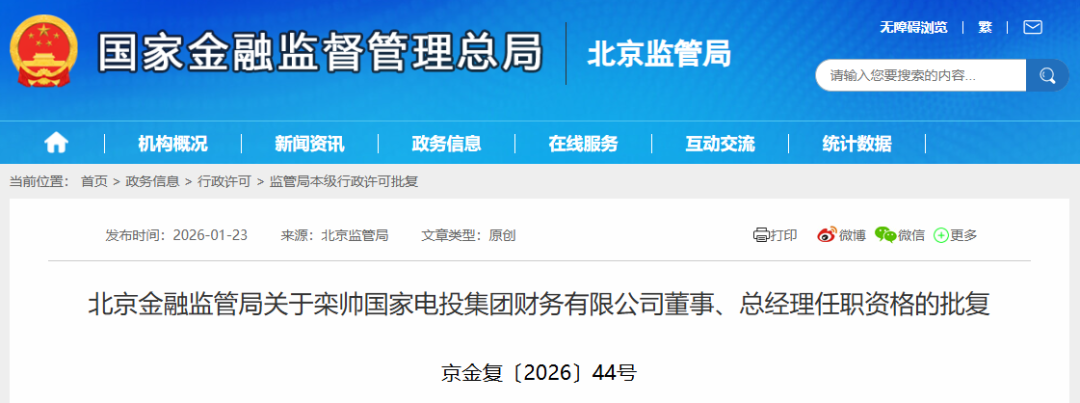 1月23日,北京金融監(jiān)管局公布批復(fù),核準(zhǔn)欒帥國(guó)家電投集團(tuán)財(cái)務(wù)有限公司董事、總經(jīng)理的任職資格。正文如下: