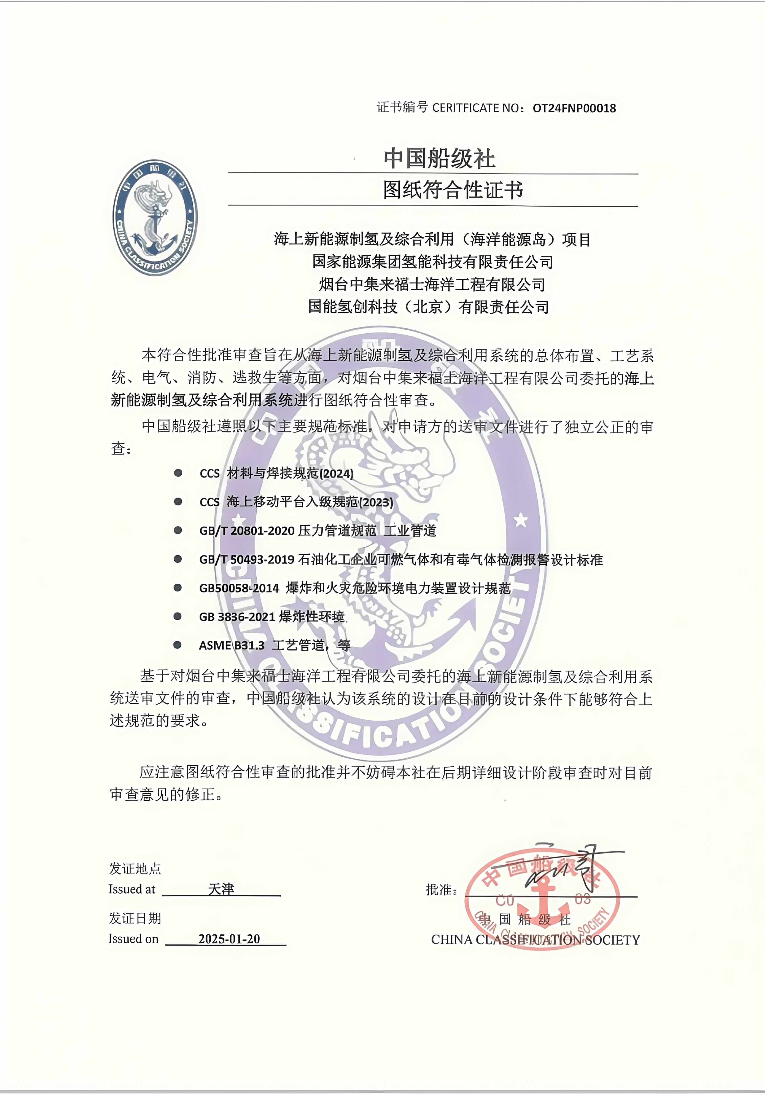 國家能源集團(tuán)海洋氫能能源島通過中國船級(jí)社審查