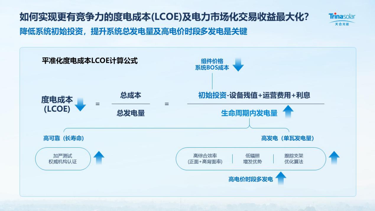 張映斌指出,實(shí)現(xiàn)更具競爭力平準(zhǔn)化度電成本,關(guān)鍵是要降低系統(tǒng)初始投資,同時(shí)提升系統(tǒng)綜合發(fā)電能量及高電價(jià)時(shí)段發(fā)電量。天合光能大基地解決方案憑借更高效i-TOPCon Ultra組件、單位面積更高功率、串功率更高來降低設(shè)備與建設(shè)成本、系統(tǒng)初始投資;通過低輻照增發(fā)優(yōu)勢、高綜合效率的組件搭配跟蹤支架優(yōu)化算法來實(shí)現(xiàn)高電價(jià)時(shí)段多發(fā)電以及生命周期內(nèi)更多發(fā)電量,最終實(shí)現(xiàn)更低度電成本。而更低的度電成本意味著更多的收益。
