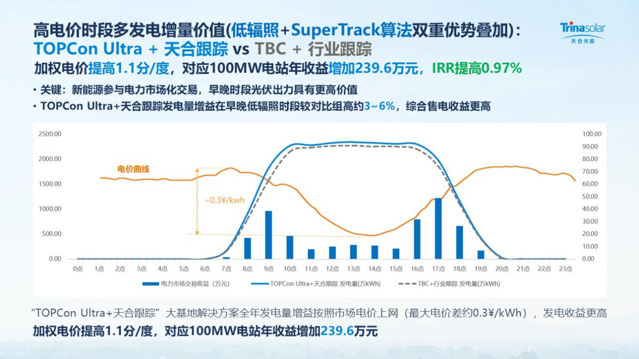 隨著新能源參與電力市場化交易深入,天合光能大基地產(chǎn)品解決方案一方面得益于i-TOPCon Ultra組件優(yōu)異的低輻照性能,在早晚可比BC增發(fā)5%-10%;另一方面,天合1P跟蹤支架更可以依據(jù)智能算法早晚靈活調(diào)節(jié)角度,在電價(jià)更高的早晚時(shí)段提升10%發(fā)電量,使每度電加權(quán)售價(jià)提高至少1.1分/千瓦時(shí)。天合光能大基地解決方案可為100兆瓦電站年收益增加239.6萬元,內(nèi)部收益率提高0.97%。