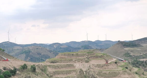 項(xiàng)目地處黃土高原,海拔高度在1570米至1790米之間,屬于典型的山地風(fēng)電。所在區(qū)域多為梁狀丘陵溝壑區(qū),地勢高低起伏不規(guī)律,各風(fēng)機(jī)之間跨度大,施工區(qū)域點(diǎn)多面廣。機(jī)組采用混合塔筒架構(gòu),風(fēng)機(jī)葉輪直徑185米,輪廓高度145米,運(yùn)輸?shù)缆菲閸绐M窄,強(qiáng)風(fēng)、降雨天氣頻繁,黃土易濕陷,大型設(shè)備運(yùn)輸難度極大,給施工作業(yè)帶來了極大的挑戰(zhàn)。
