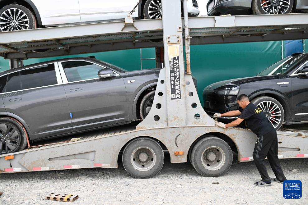 5月23日,在哈薩克斯坦扎爾肯特鎮(zhèn)的中轉(zhuǎn)停車場,運(yùn)輸公司工作人員裝載進(jìn)口自中國的汽車。車輛將被運(yùn)往哈薩克斯坦各大城市、中亞其他國家、俄羅斯等目的地。新華社記者李任滋攝
