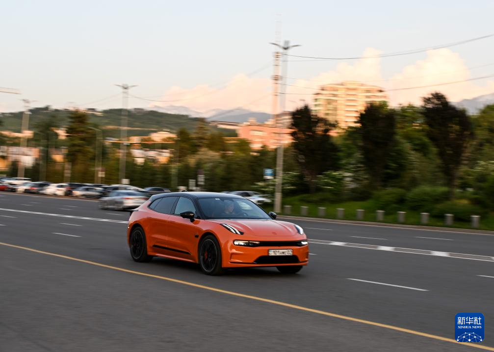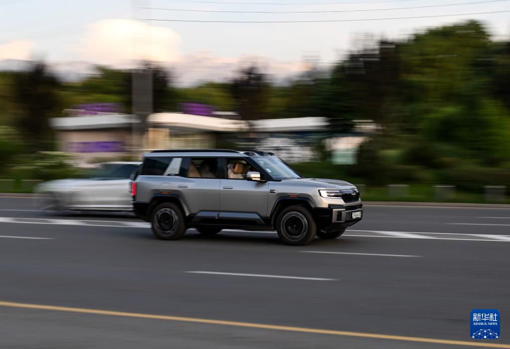 5月15日,一輛中國品牌新能源汽車行駛在哈薩克斯坦阿拉木圖市區(qū)。新華社記者李任滋攝
