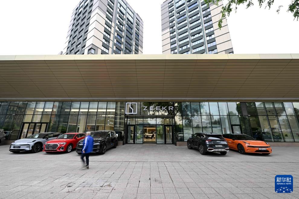 5月26日,在哈薩克斯坦阿拉木圖市區(qū),一名男子從一家中國品牌新能源汽車門店前走過。新華社記者李任滋攝