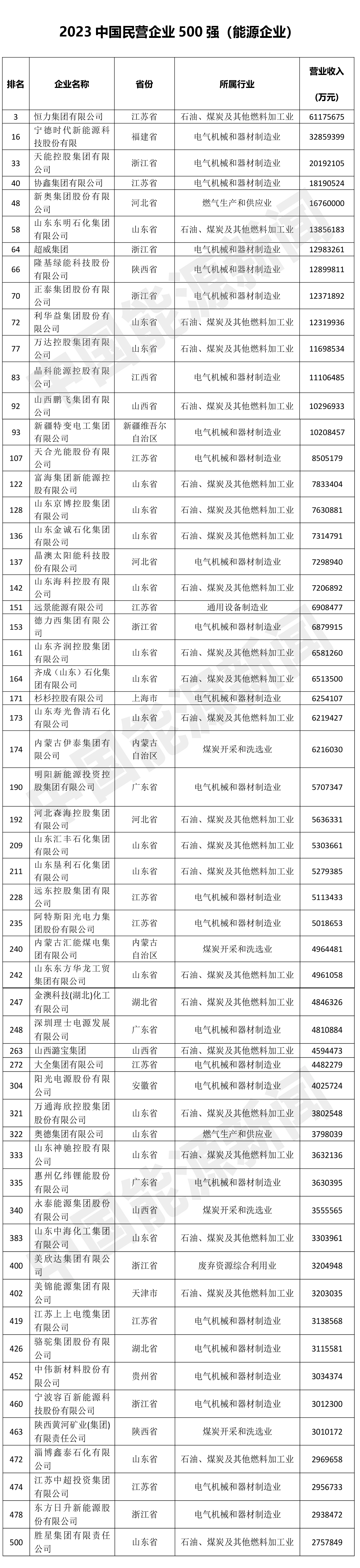 中國能源新聞網(wǎng)訊(記者 李欣智)9月12日,全國工商聯(lián)發(fā)布“2023中國民營企業(yè)500強(qiáng)”榜單,據(jù)中國能源新聞網(wǎng)記者統(tǒng)計,共有57家能源企業(yè)上榜。上榜的能源民營企業(yè)中,營業(yè)收入超千億的有14家,其中恒力集團(tuán)有限公司位列總排行榜第3位,營業(yè)收入達(dá)6117.56億元。按所屬行業(yè)分類,57家上榜的能源民營企業(yè)中,石油、煤炭及其他燃料加工企業(yè)共24家;電氣機(jī)械和器材制造企業(yè)共25家;燃?xì)馍a(chǎn)和供應(yīng)業(yè)企業(yè)2家;煤炭開采和洗選企業(yè)4家;通用設(shè)備制造企業(yè)1家;廢棄資源綜合利用企業(yè)1家。具體如下表: