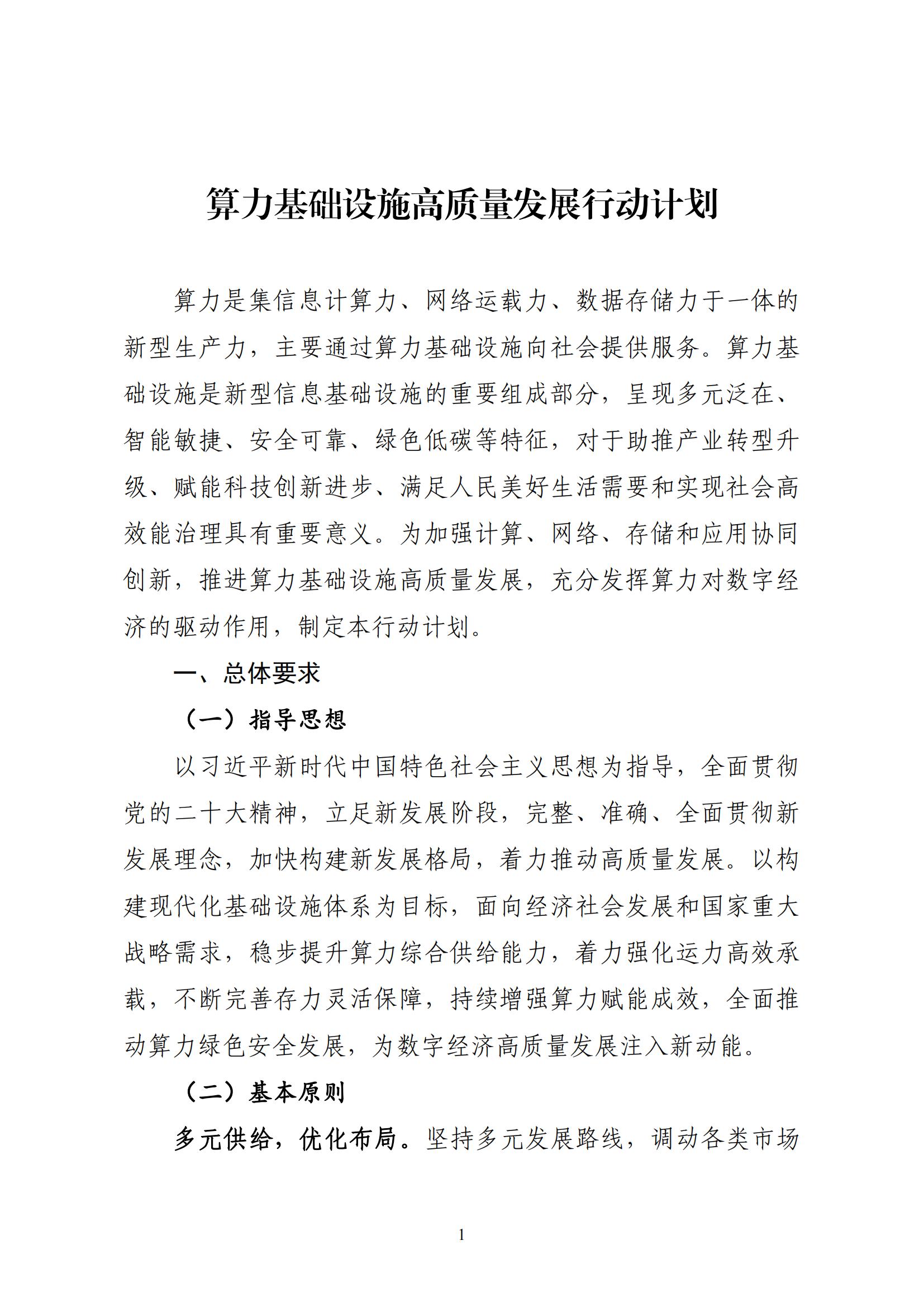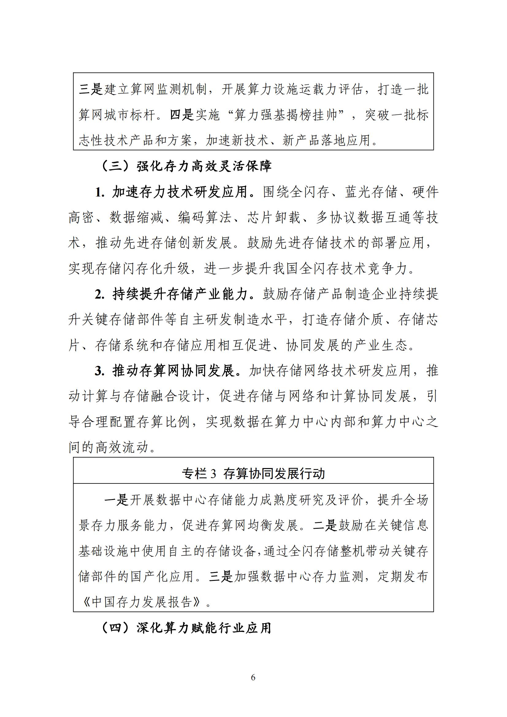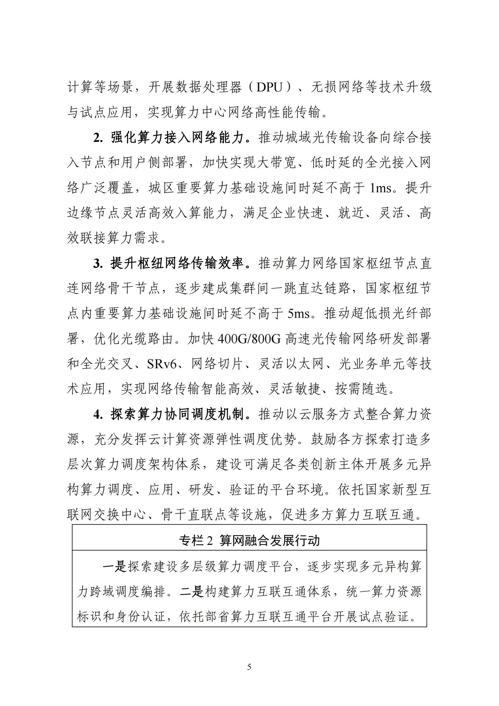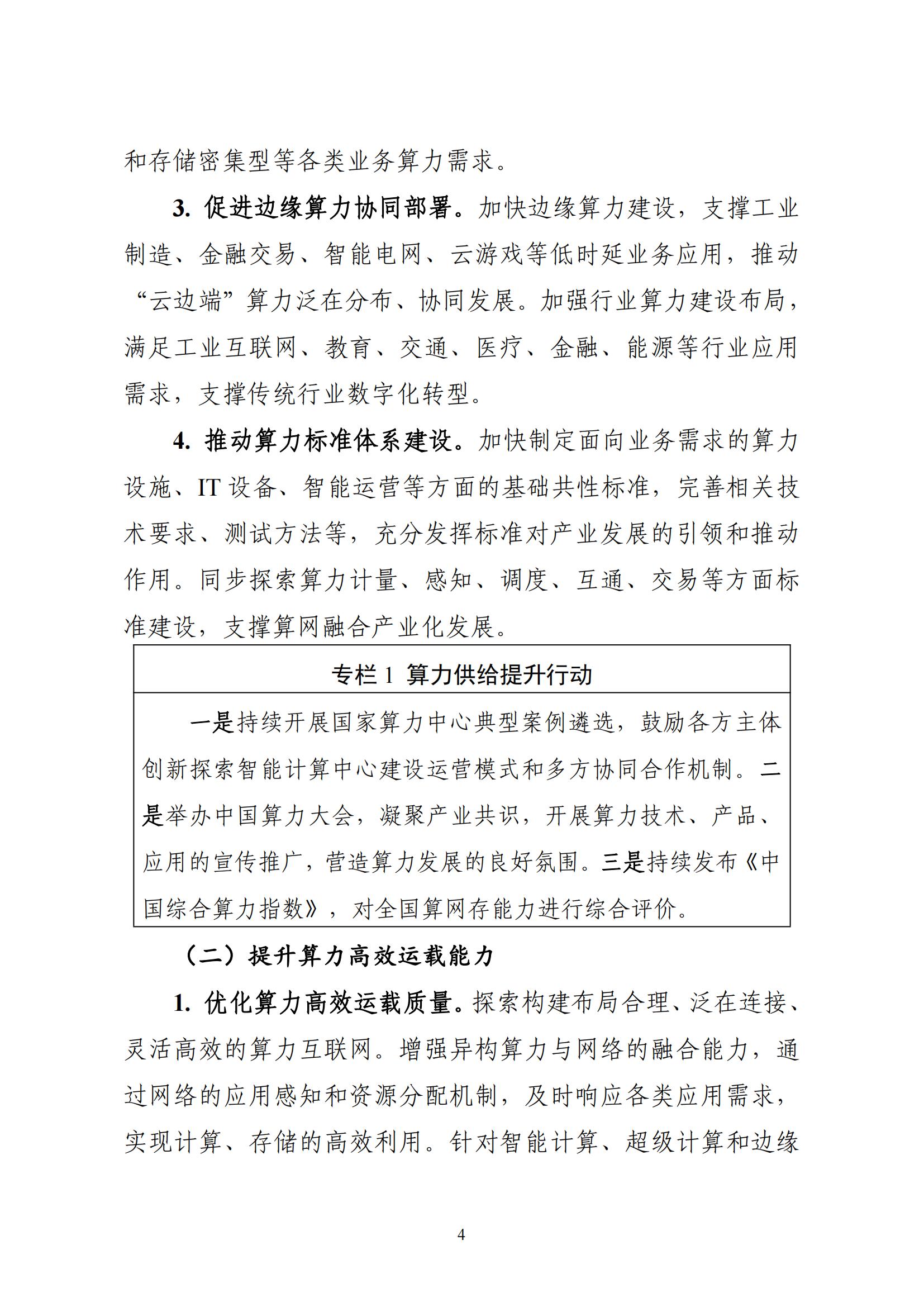 工業(yè)和信息化部、中央網(wǎng)信辦、教育部、國(guó)家衛(wèi)生健康委、中國(guó)人民銀行、國(guó)務(wù)院國(guó)資委等六部門近日聯(lián)合印發(fā)《算力基礎(chǔ)設(shè)施高質(zhì)量發(fā)展行動(dòng)計(jì)劃》,提出到2025年,計(jì)算力方面,算力規(guī)模超過(guò)300 EFLOPS,智能算力占比達(dá)到35%,東西部算力平衡協(xié)調(diào)發(fā)展。運(yùn)載力方面,國(guó)家樞紐節(jié)點(diǎn)數(shù)據(jù)中心集群間基本實(shí)現(xiàn)不高于理論時(shí)延1.5倍的直連網(wǎng)絡(luò)傳輸,重點(diǎn)應(yīng)用場(chǎng)所光傳送網(wǎng)(OTN)覆蓋率達(dá)到80%,骨干網(wǎng)、城域網(wǎng)全面支持IPv6,SRv6等創(chuàng)新技術(shù)使用占比達(dá)到40%。存儲(chǔ)力方面,存儲(chǔ)總量超過(guò)1800EB,先進(jìn)存儲(chǔ)容量占比達(dá)到30%以上,重點(diǎn)行業(yè)核心數(shù)據(jù)、重要數(shù)據(jù)災(zāi)備覆蓋率達(dá)到100%。