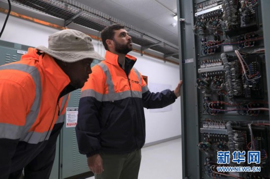 8月10日,在南非北開普省德阿鎮(zhèn),當(dāng)?shù)鼐用?、變電站工作人員達(dá)斯溫·巴松(左)與變電站副主管雷加特·范滕德在龍?jiān)茨戏枪镜掳L(fēng)電項(xiàng)目變電站工作。新華社記者董江輝 攝