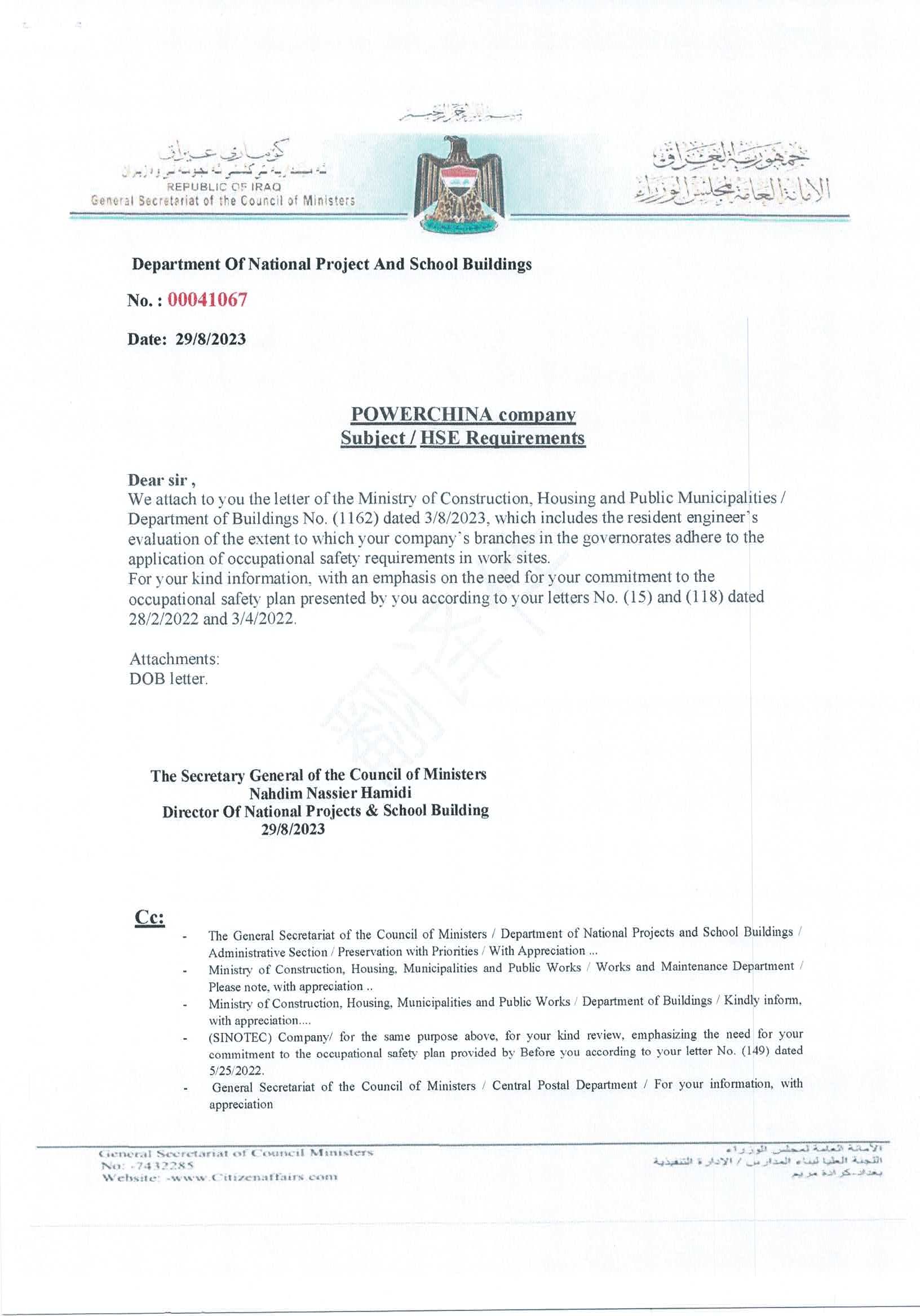 近日,伊拉克示范學(xué)校(米桑?。╉椖拷?jīng)理部收到項目業(yè)主伊拉克內(nèi)閣秘書處的正式信函,反饋了伊拉克住建部對伊拉克示范學(xué)校項目各參建單位HSE管理工作的考核結(jié)果。中國電力建設(shè)集團(tuán)有限公司所屬山東電建憑借優(yōu)秀的HSE管理能力,成功獲評優(yōu)秀等級。伊拉克內(nèi)閣秘書處及監(jiān)理對伊拉克示范學(xué)校(米桑省)項目經(jīng)理部團(tuán)隊在HSE管理中取得的成績和辛勤付出給予充分肯定和高度評價。