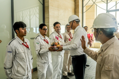 圖為劉國(guó)躍視察集團(tuán)公司爪哇7號(hào)煤電項(xiàng)目,看望慰問中印尼一線員工代表