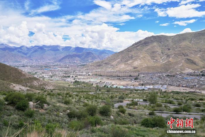 2025年7月16日,從西藏拉薩娘熱溝俯瞰,南北山的綠色植被環(huán)抱拉薩城區(qū)。中新社記者張祥毅攝
