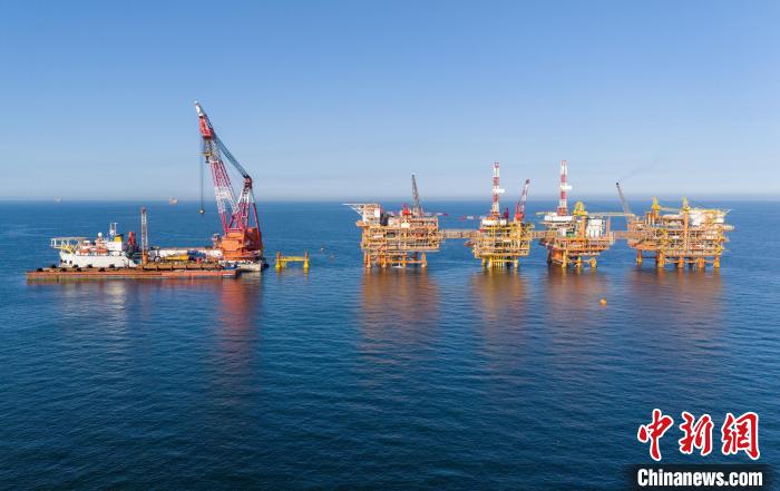 中國(guó)海上最大自營(yíng)油田綏中36-1岸電導(dǎo)管架完成吊裝。中國(guó)海油天津分公司供圖