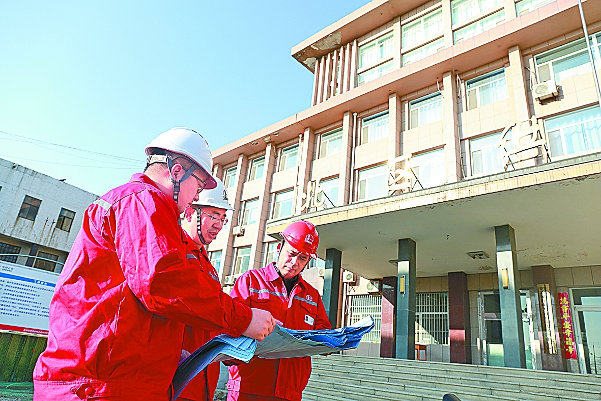 勝利油田新能源開發(fā)中心技術(shù)人員在研究北區(qū)供電公司辦公樓淺層地?zé)犴?xiàng)目施工圖紙。