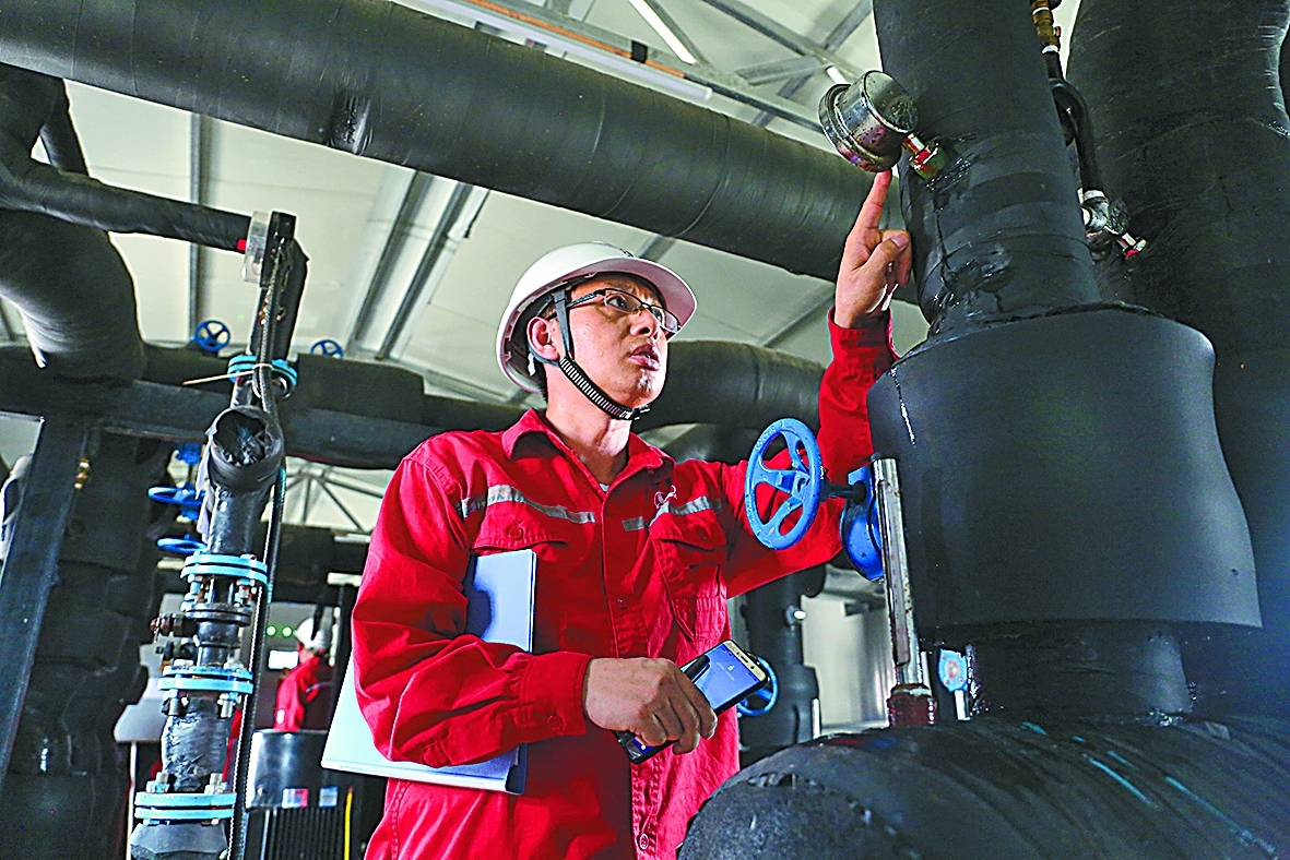 勝利油田新能源開發(fā)中心技術(shù)人員在東勝公司無(wú)棣管理區(qū)辦公樓檢查淺層地?zé)犴?xiàng)目設(shè)備。