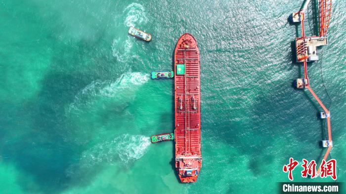 3月31日,30萬噸級(jí)“光匯”輪順利靠泊位于廣東揭陽的廣東石化公司原油碼頭。(高云龍攝)