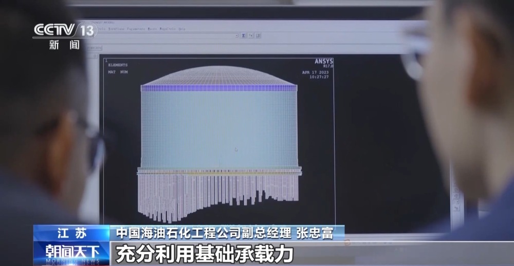 中國海油石化工程公司副總經(jīng)理 張忠富:設(shè)計團隊創(chuàng)新開發(fā)了新型的群樁承載力計算方法,充分利用基礎(chǔ)承載力,建造團隊首次采用一體化成樁技術(shù),讓超大型儲罐能夠立得住、站得穩(wěn)。