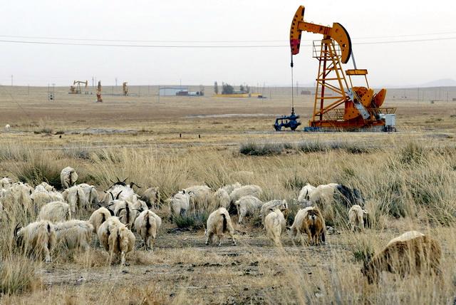 石油天然氣開采過程中會(huì)產(chǎn)生大量固體廢物,存在環(huán)境風(fēng)險(xiǎn)隱患。圖為西北某地草場上的采油設(shè)施。攝影/章軻