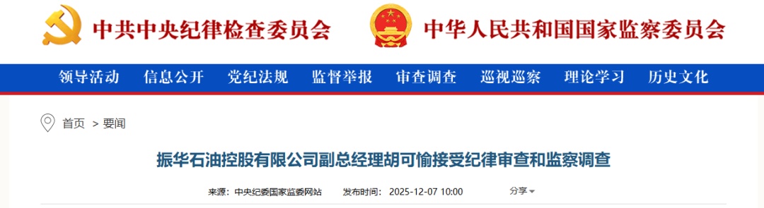 中央紀(jì)委國(guó)家監(jiān)委網(wǎng)站12月7日消息,據(jù)中央紀(jì)委國(guó)家監(jiān)委駐中國(guó)兵器工業(yè)集團(tuán)有限公司紀(jì)檢監(jiān)察組消息:振華石油控股有限公司副總經(jīng)理胡可愉涉嫌嚴(yán)重違紀(jì)違法,目前正接受中央紀(jì)委國(guó)家監(jiān)委駐中國(guó)兵器工業(yè)集團(tuán)有限公司紀(jì)檢監(jiān)察組紀(jì)律審查和監(jiān)察調(diào)查。