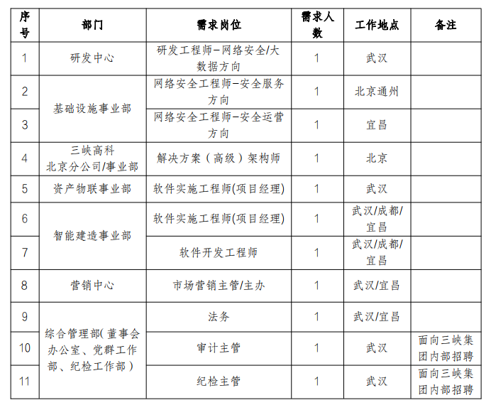 具體崗位主要職責及資格條件詳見附件1。其中,審計主管及紀檢主管崗位報名范圍僅限三峽集團內部員工(簽訂勞動合同)報名。