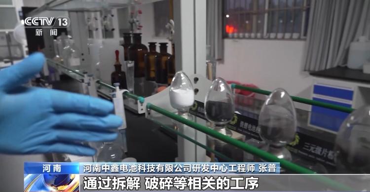 河南中鑫電池科技有限公司研發(fā)中心工程師 張普:這是我們從電池廠家回收過來的廢舊鋰電池,通過拆解、破碎等相關(guān)的工序做成鐵鋰電池粉及三元電池粉,通過浸出、除雜、沉鋰等相關(guān)的反應(yīng),做成電池級碳酸鋰,再一次運(yùn)用到電池正極材料的生產(chǎn)過程當(dāng)中,實(shí)現(xiàn)了廢舊鋰電池的循環(huán)回收再利用。
