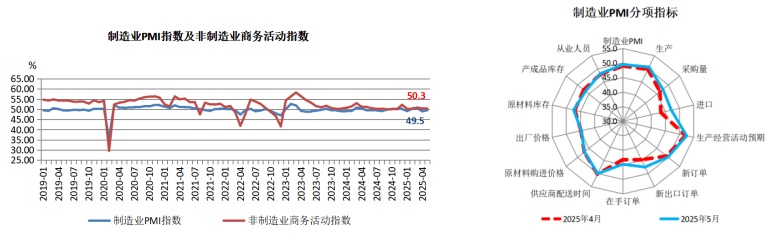 5月份,制造業(yè)采購經(jīng)理指數(shù)(PMI)49.5%,比上月回升0.5個(gè)百分點(diǎn);非制造業(yè)商務(wù)活動(dòng)指數(shù)為50.3%,比上月下降0.1個(gè)百分點(diǎn);綜合PMI產(chǎn)出指數(shù)為50.4%,比上月上升0.2個(gè)百分點(diǎn),我國經(jīng)濟(jì)總體產(chǎn)出保持?jǐn)U張。隨著中美經(jīng)貿(mào)高層會(huì)談重要共識(shí)的達(dá)成、雙方互降關(guān)稅舉措的落地,5月份,我國制造業(yè)出口下行態(tài)勢放緩,新出口訂單指數(shù)為47.5%,較上月上升2.8個(gè)百分點(diǎn)。疊加國內(nèi)需求穩(wěn)定釋放,市場需求整體趨穩(wěn)運(yùn)行,新訂單指數(shù)為49.8%,較上月上升0.6個(gè)百分點(diǎn)。市場需求的趨穩(wěn)帶動(dòng)制造業(yè)企業(yè)生產(chǎn)活動(dòng)止降回升。5月份,制造業(yè)生產(chǎn)指數(shù)為50.7%,較上月上升0.9個(gè)百分點(diǎn),在短暫降至50%以下后重回?cái)U(kuò)張區(qū)間。原材料采購活動(dòng)相應(yīng)有所回穩(wěn),采購量指數(shù)為47.6%,較上月上升1.3個(gè)百分點(diǎn)。