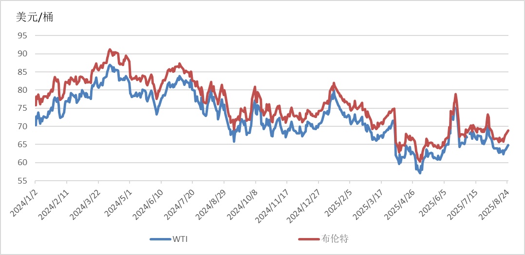截至8月25日,WTI、布倫特原油期貨價格分別收于64.8美元/桶、68.8美元/桶,月環(huán)比分別下降0.55%、上漲0.53%,相較于2024年同期的77.42美元/桶、81.43美元/桶,分別下降16.30%、15.51%。