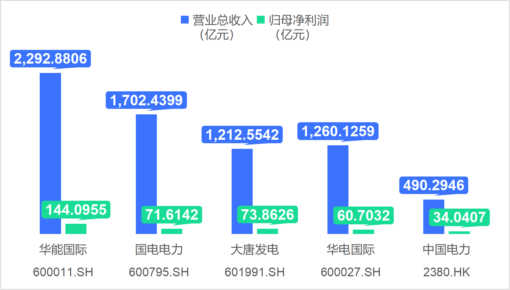 其中,華能國(guó)際以營(yíng)收2292.88億元、歸母凈利潤(rùn)144.1億元高居榜首,成為五大企業(yè)中唯一營(yíng)收破兩千億、盈利超百億的上市公司,與其他企業(yè)拉開較大差距。