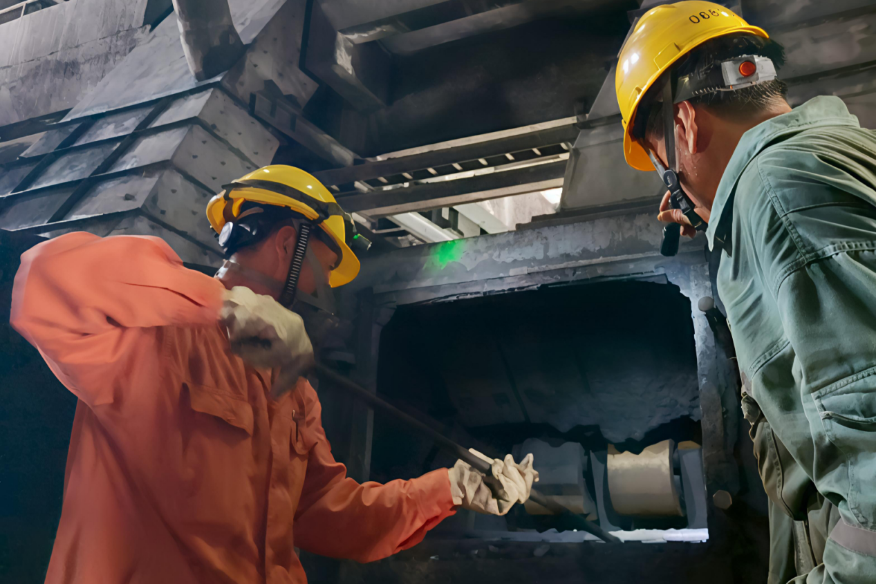 17時,各崗位剛接班,對講機傳來:“二期1號碎煤機粘煤嚴(yán)重,急需清理!”張紅軍帶著方明偉沖進(jìn)碎煤機室,剛停的雨讓室內(nèi)濕度近90%,煤塊粘在襯板上像焊死了一樣?!白ゾo時間清理,鍋爐等米下鍋呢!”他打開頭燈探進(jìn)人孔門,熱氣混著煤蒸氣撲面而來,釬子捅下去,水管沖上去,只留下個淺坑。張紅軍索性跪在設(shè)備旁,頭和手從人孔門伸進(jìn)落煤筒,一手握住膠管,另一只手用力捏著膠管頭,讓噴出去的水更集中、水壓更大,并讓高壓水在落煤筒襯板與粘煤之間集中“力量”破開粘煤,汗水混著煤水順著安全帽帶往下滴,工服濕得能擰出水。突然“轟隆”一聲,大塊粘煤墜落在皮帶上,他抹了把臉笑了:“通了!”這招還是以前雨季黨員攻堅組琢磨的法子。