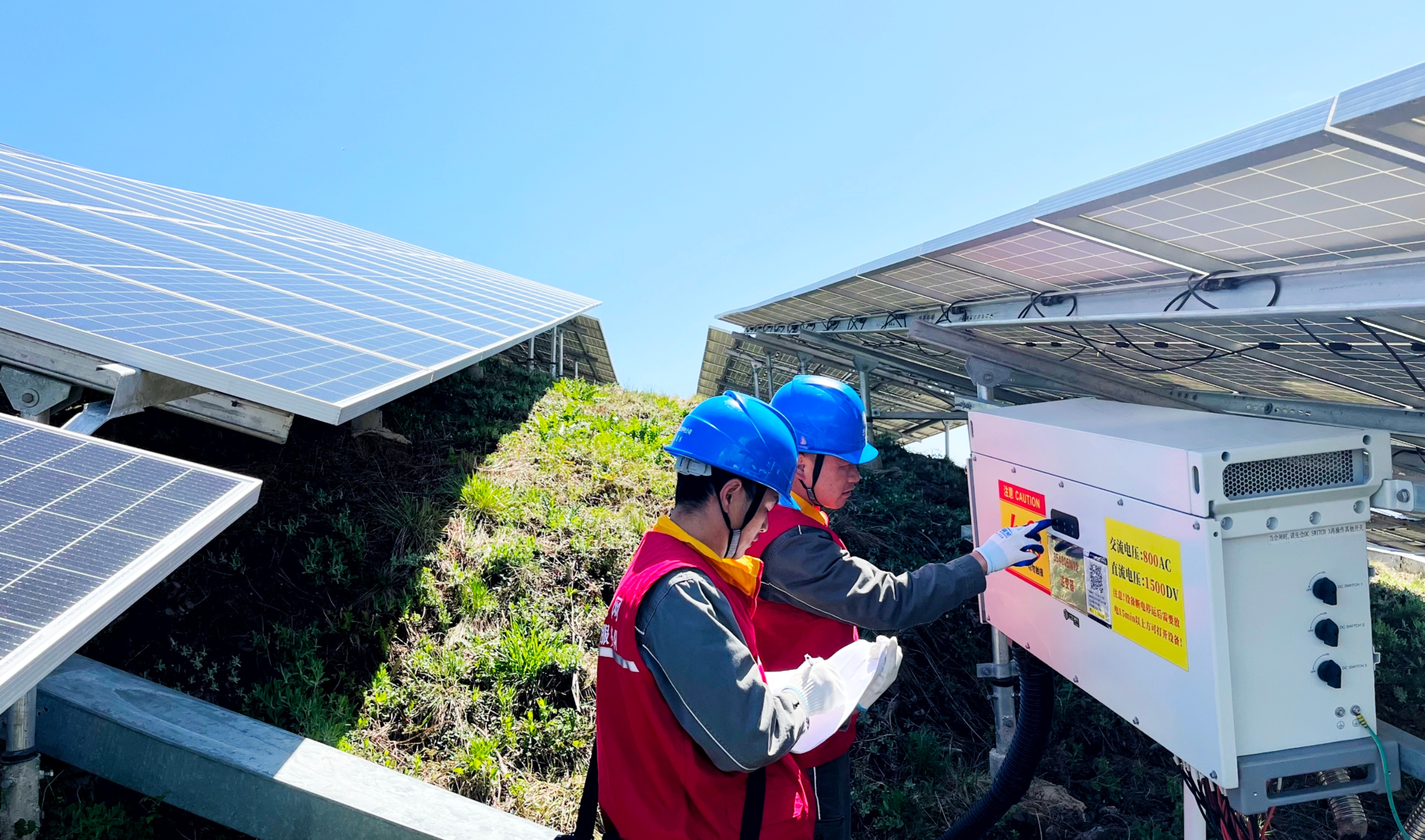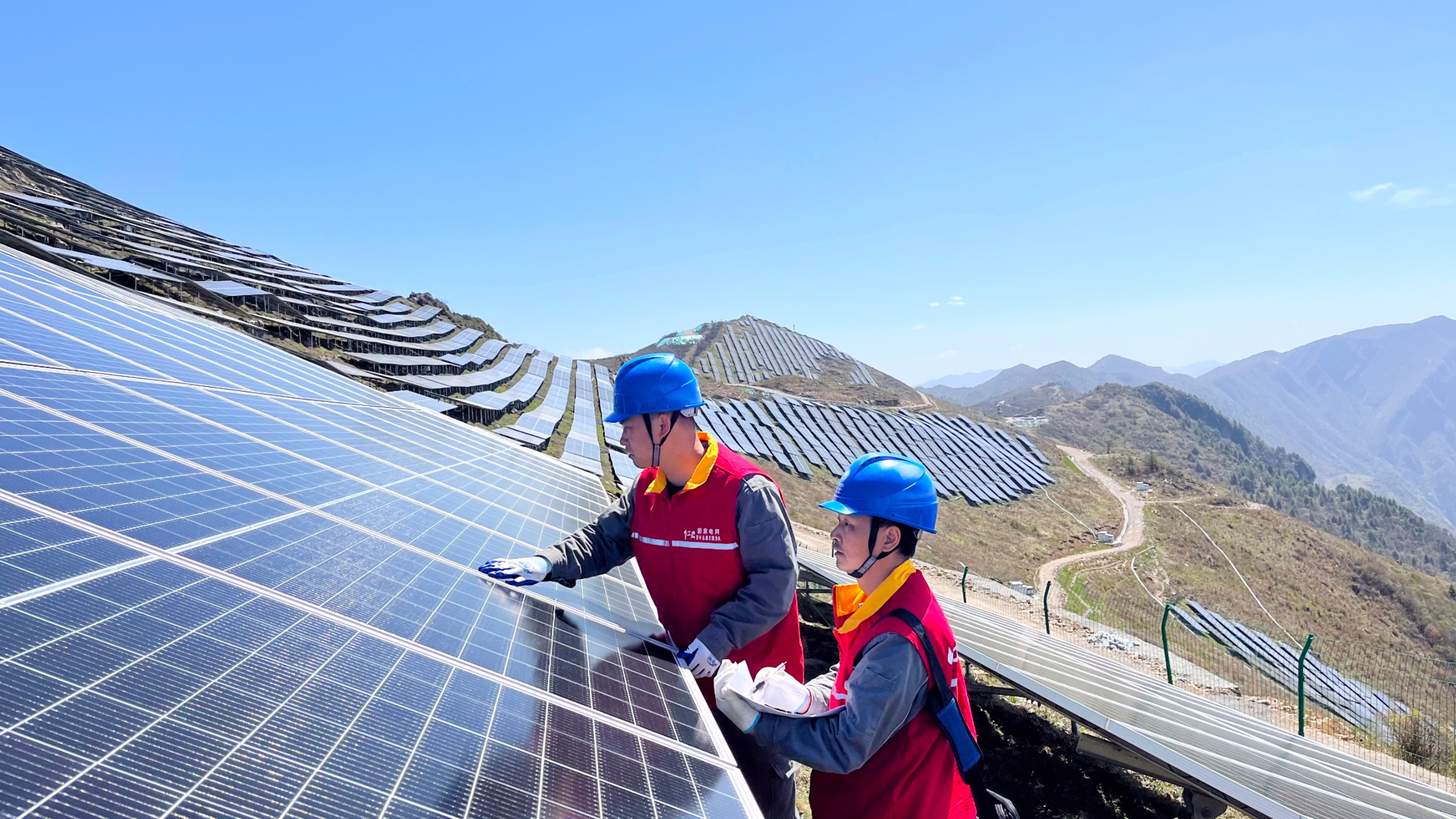 國(guó)家電網(wǎng)紅巖(城口)共產(chǎn)黨員服務(wù)隊(duì)隊(duì)員在城口縣咸宜二期光伏電站開(kāi)展設(shè)備檢查維護(hù)。雷挺 攝