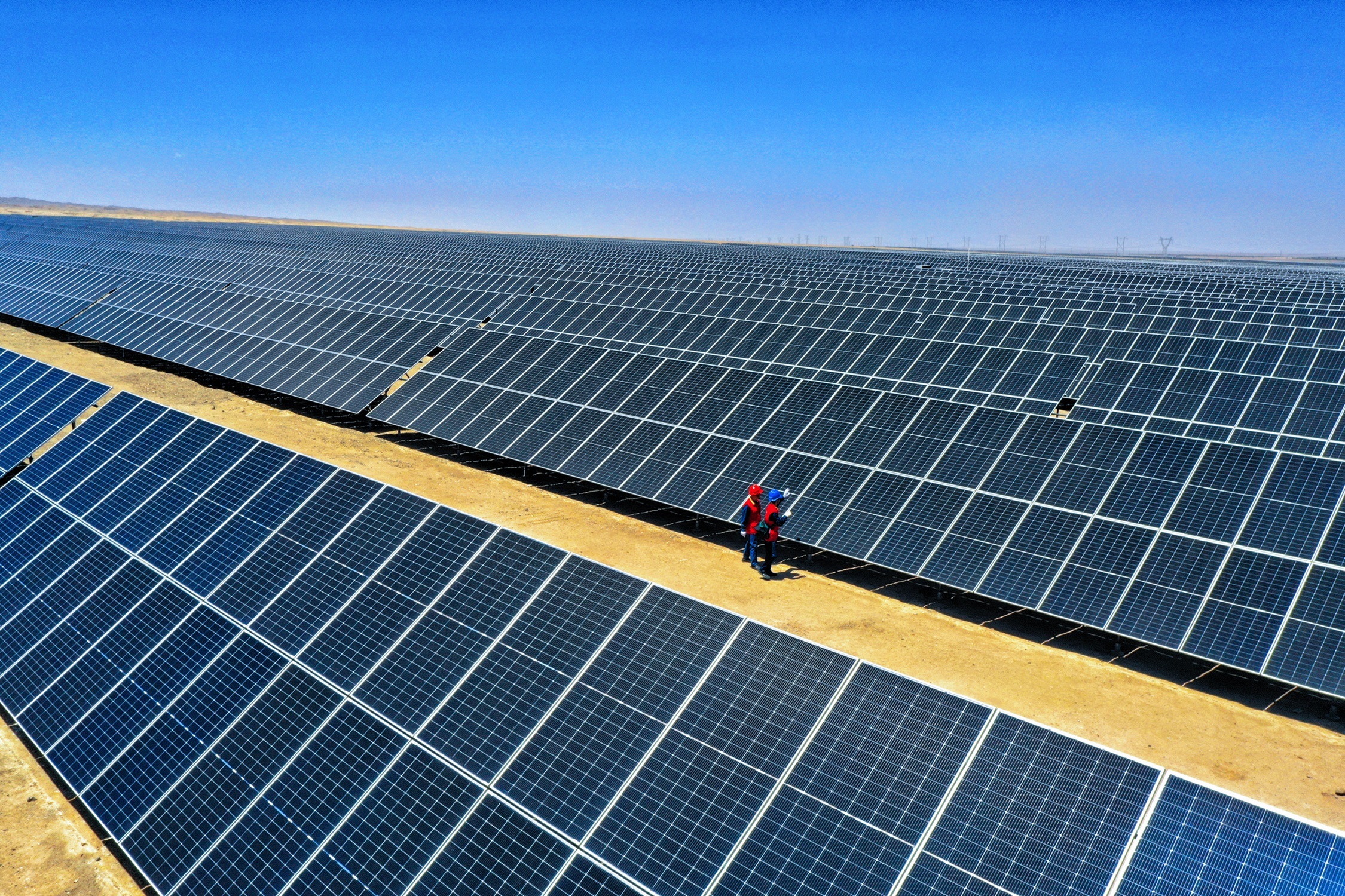 國網(wǎng)喀什供電公司員工在莎車縣新華光伏產(chǎn)業(yè)園進(jìn)行檢查。(王康 攝)