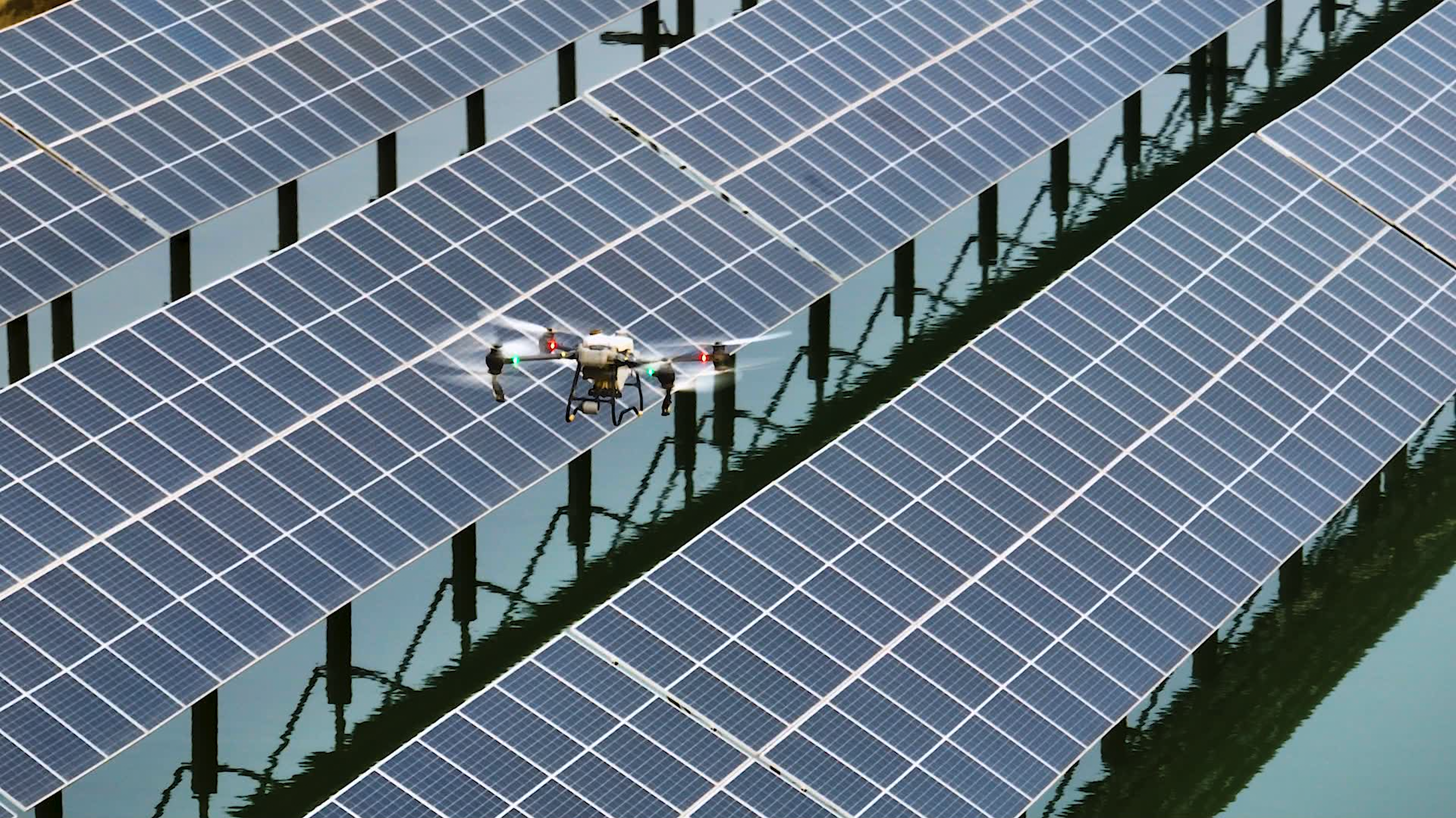 12月12日,在濰坊壽光營里恒遠光伏除雪演練現(xiàn)場,工作人員正在通過無人機噴灑融雪劑形式去除光伏板上的積雪。