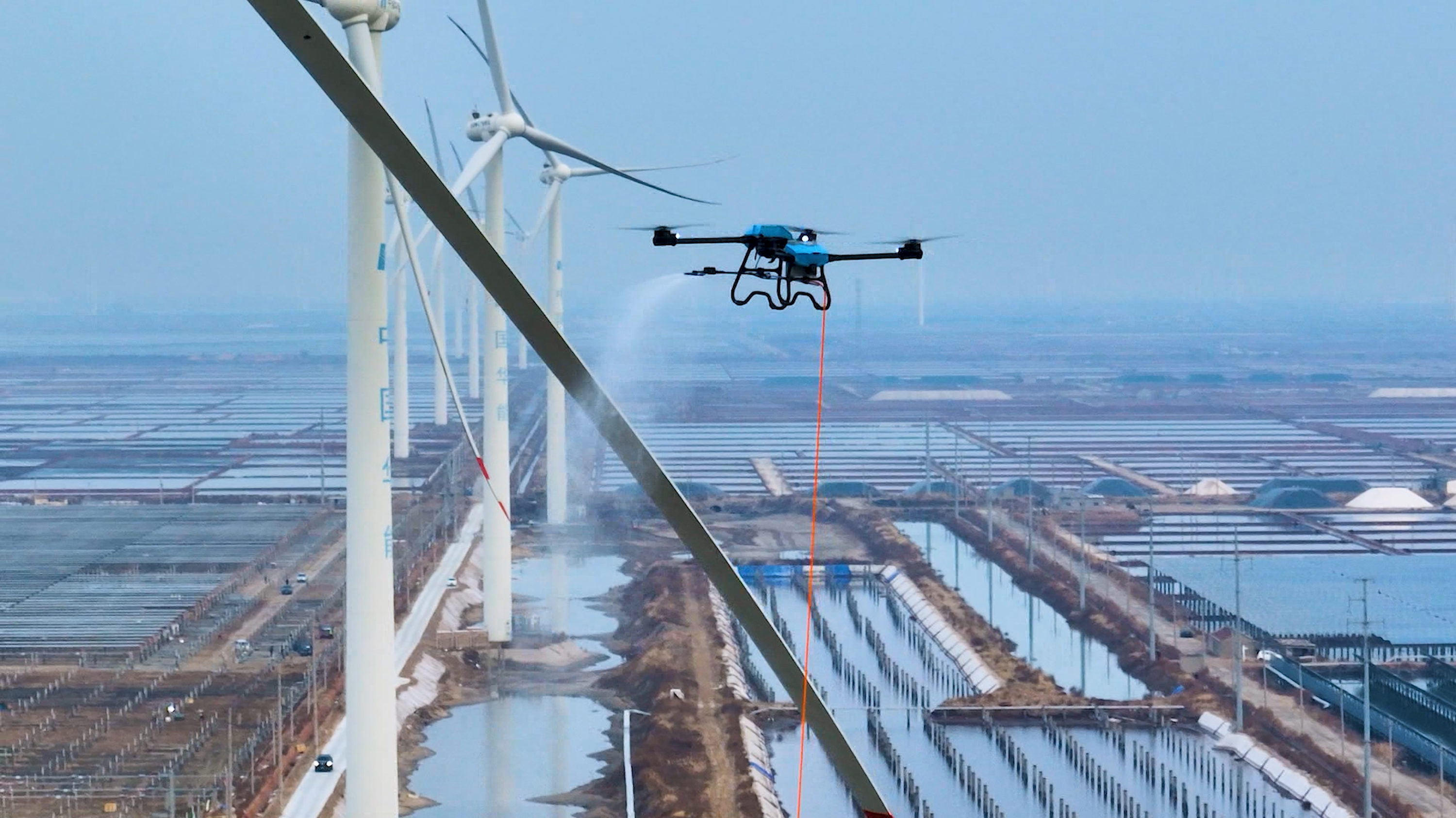 12月12日,在濰坊壽光宅科華能風機除冰演練現(xiàn)場,工作人員正在通過無人機噴灑融冰劑形式去除風機葉片的覆冰。