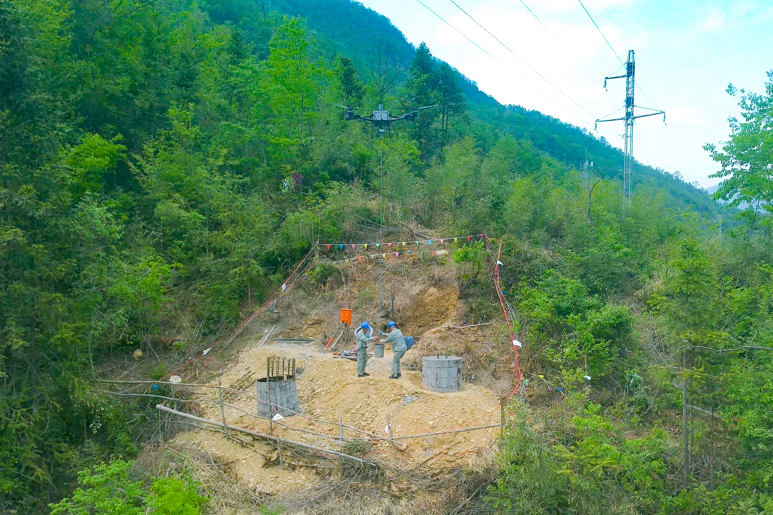 泉溪鎮(zhèn)山大林密、溝壑縱橫,傳統(tǒng)的騾馬運(yùn)輸方式,需征用林木,開(kāi)辟運(yùn)輸便道。為減少生態(tài)影響,電力施工人員搭建起空中物流專線,通過(guò)“山下集結(jié)、空中配送、山上施工”的物資運(yùn)輸模式,實(shí)現(xiàn)從混凝土攪拌站到山間施工平臺(tái)的點(diǎn)對(duì)點(diǎn)投送,在復(fù)雜山地條件下建設(shè)電網(wǎng)。