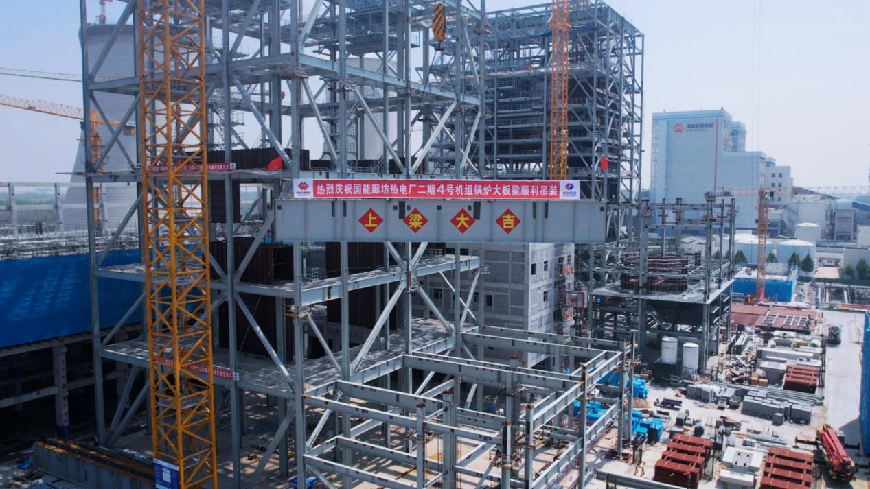 國電電力廊坊熱電世界首例耦合煙氣熔鹽儲熱鍋爐大板梁吊裝施工現(xiàn)場。