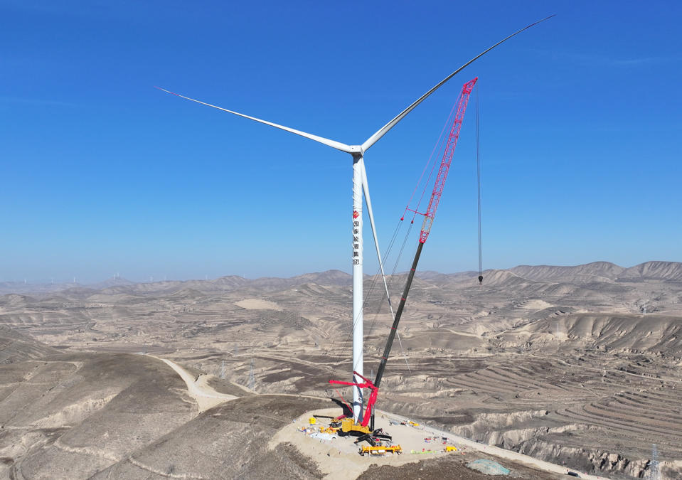 該項目位于寧夏回族自治區(qū)中衛(wèi)市海原縣境內(nèi),是我國首個獲得國家發(fā)展改革委和國家能源局雙批復(fù)的“沙戈荒”能源大基地的重要組成部分、“寧電入湘”工程重點配套項目。項目規(guī)劃總裝機(jī)容量100萬千瓦,安裝140臺單機(jī)容量7.15兆瓦的風(fēng)電機(jī)組,風(fēng)機(jī)輪轂高度125米,葉輪直徑220米,是寧夏區(qū)域單機(jī)容量最大的風(fēng)電項目。面對復(fù)雜的建設(shè)條件,該公司積極組織施工單位、設(shè)計單位、風(fēng)機(jī)廠家、塔筒廠家、監(jiān)理單位開展研究,充分考慮黃土高原易塌陷、氣溫低、風(fēng)速大等特殊因素,精心制定吊裝專項方案,創(chuàng)新采用“空-高-地”三位一體智能監(jiān)控體系,全面加強(qiáng)設(shè)備運(yùn)輸、吊裝全過程監(jiān)督,安全順利完成首臺風(fēng)機(jī)吊裝任務(wù)。