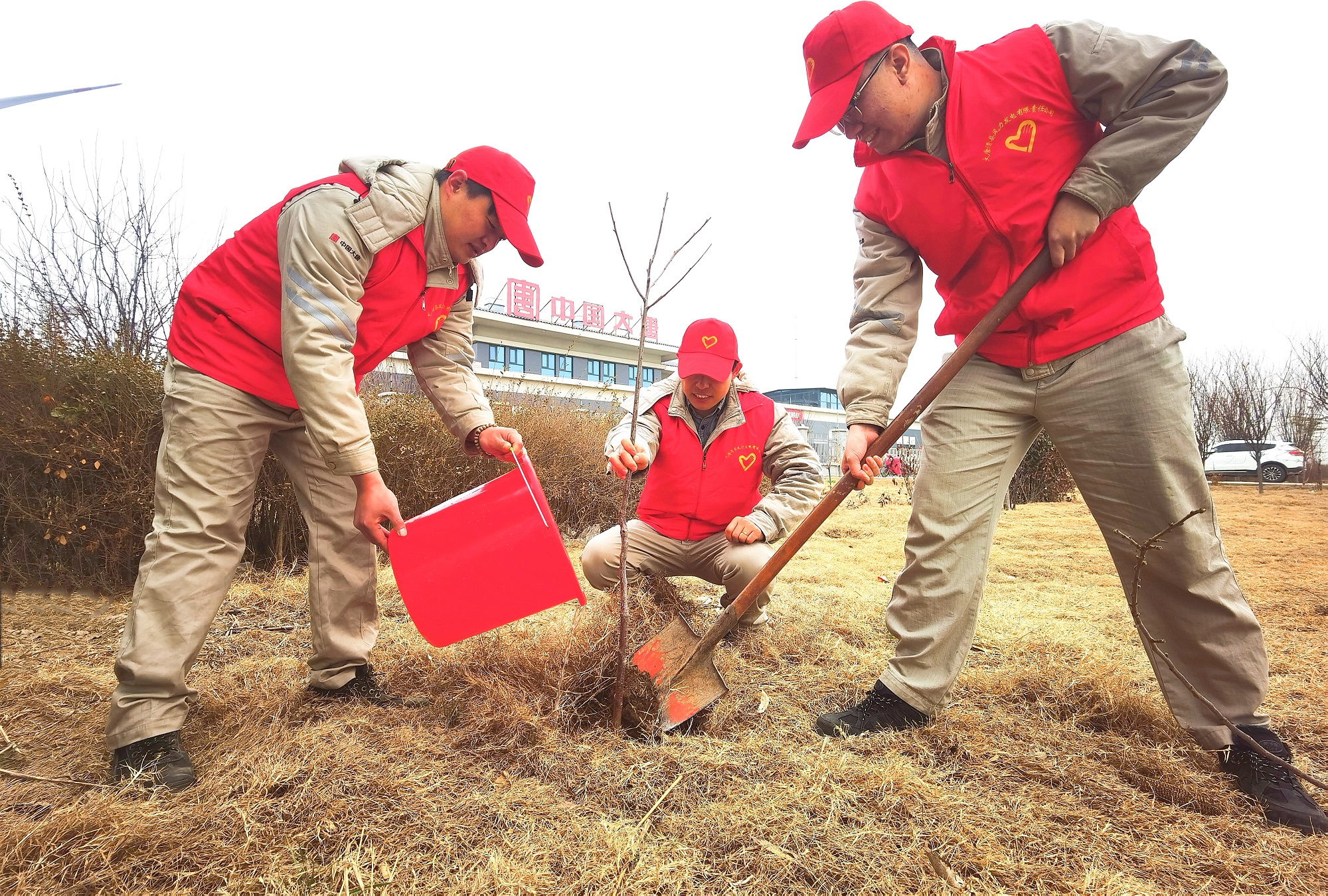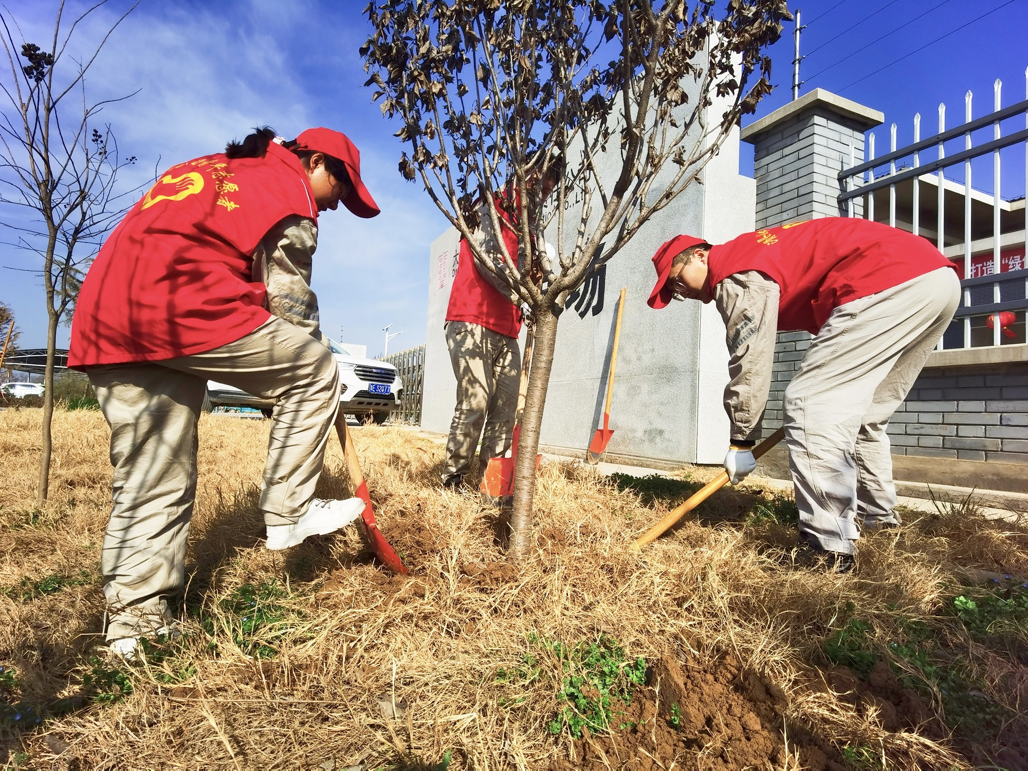 活動現(xiàn)場微風(fēng)和煦,大家熱情高漲、干勁十足,志愿者們一同揮鋤掄鍬、挖坑扶苗、提水澆灌,大家三五人一組,每道工序緊密銜接、配合默契,不一會,樹苗便在志愿者的幫助下“安家落戶”,為豫北大地增添了一抹春意。