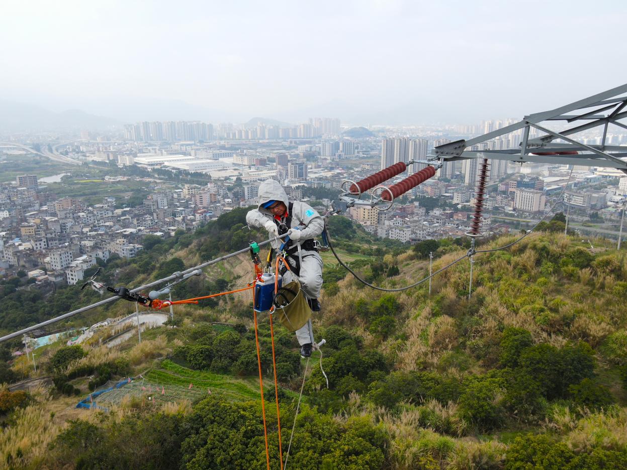 國(guó)網(wǎng)福州供電公司輸電帶電作業(yè)人員在福建省福州市閩侯縣祥謙鎮(zhèn)蘭圃村110千伏長(zhǎng)圃Ⅱ路21號(hào)塔進(jìn)行帶電檢修?!£惖骡x 攝