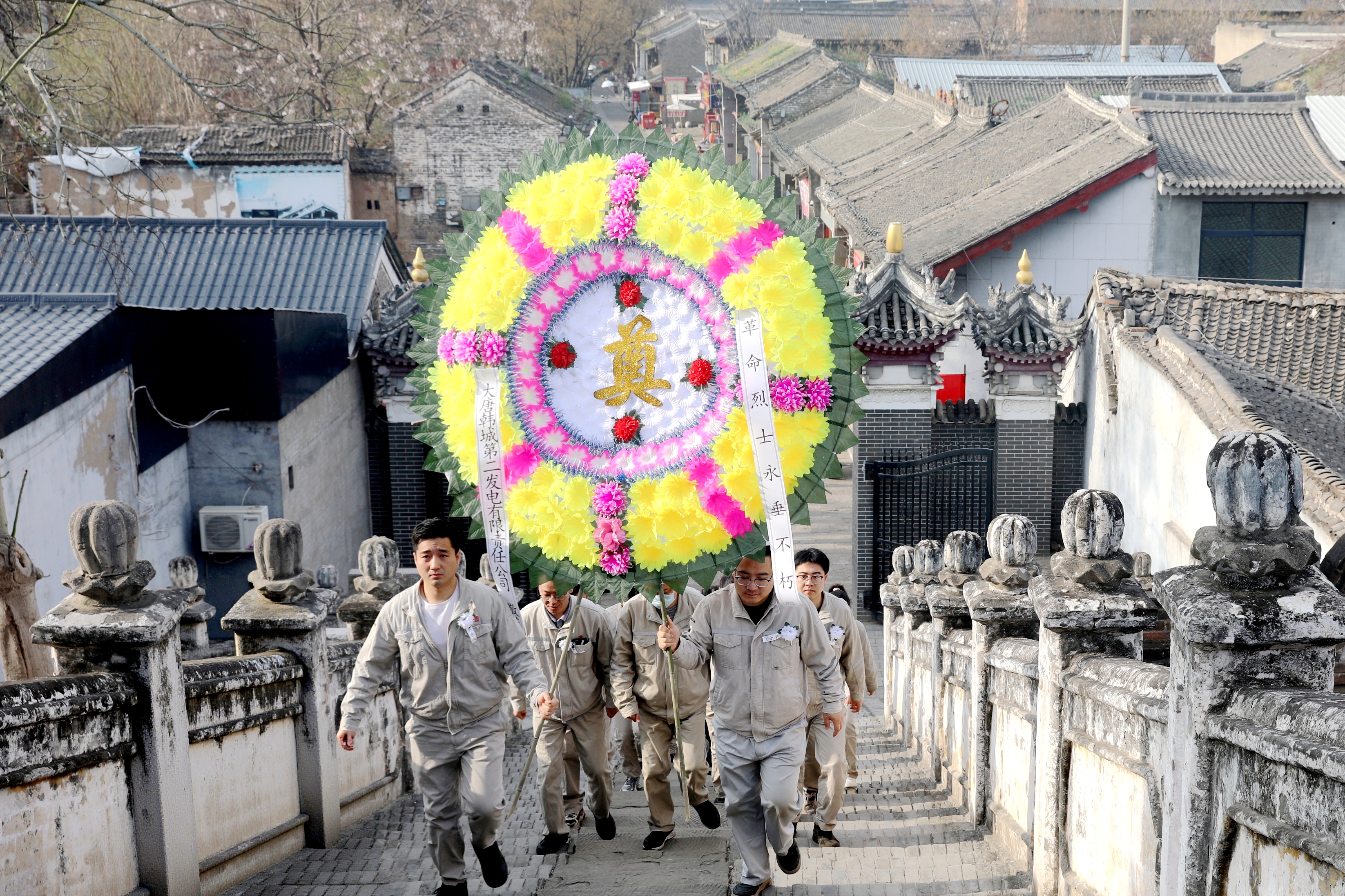 烈士陵園內(nèi)松柏蒼翠、莊嚴肅穆,革命烈士紀念塔巍然屹立。全體人員佩戴小白花,整齊列隊,神情嚴肅,在紀念塔前肅立默哀,向313名在國內(nèi)革命戰(zhàn)爭、抗日戰(zhàn)爭、抗美援朝、中印反擊戰(zhàn)等戰(zhàn)爭中以及社會主義建設(shè)和改革開放時期獻身的烈士行鞠躬禮,深切悼念他們?yōu)榱巳嗣窠夥?、民族獨立和國家建設(shè)作出的英勇貢獻。
