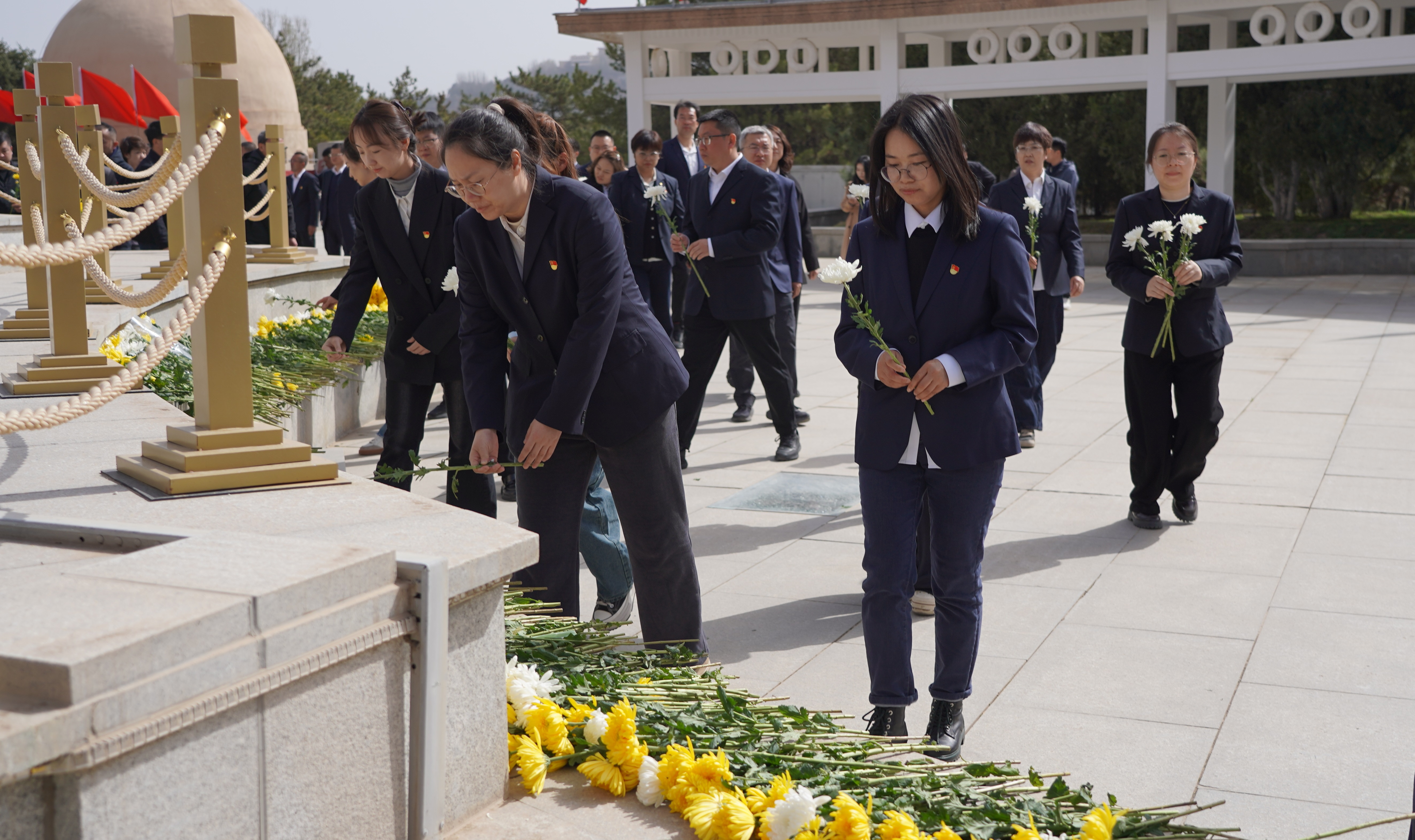 在巍峨的革命烈士紀(jì)念碑前,祭奠儀式正式拉開帷幕。大家整齊列隊(duì),神情肅穆,首先奏響中華人民共和國國歌,員工們高亢嘹亮的歌聲在陵園上空回蕩,飽含著對祖國的熱愛與對先烈的敬意。全場肅立,集體默哀三分鐘,隨后,伴隨著低沉肅穆的獻(xiàn)花曲,優(yōu)秀青年代表穩(wěn)穩(wěn)抬起花籃,緩步拾階而上,鄭重安放于塔基座前。大家依次瞻仰紀(jì)念碑,將一朵朵寄托哀思的菊花放置在紀(jì)念碑周圍,深深鞠躬,致以真摯敬意,表達(dá)對先烈的無限崇敬與繼承遺志的堅(jiān)定決心,無聲訴說著跨越時空的懷念。