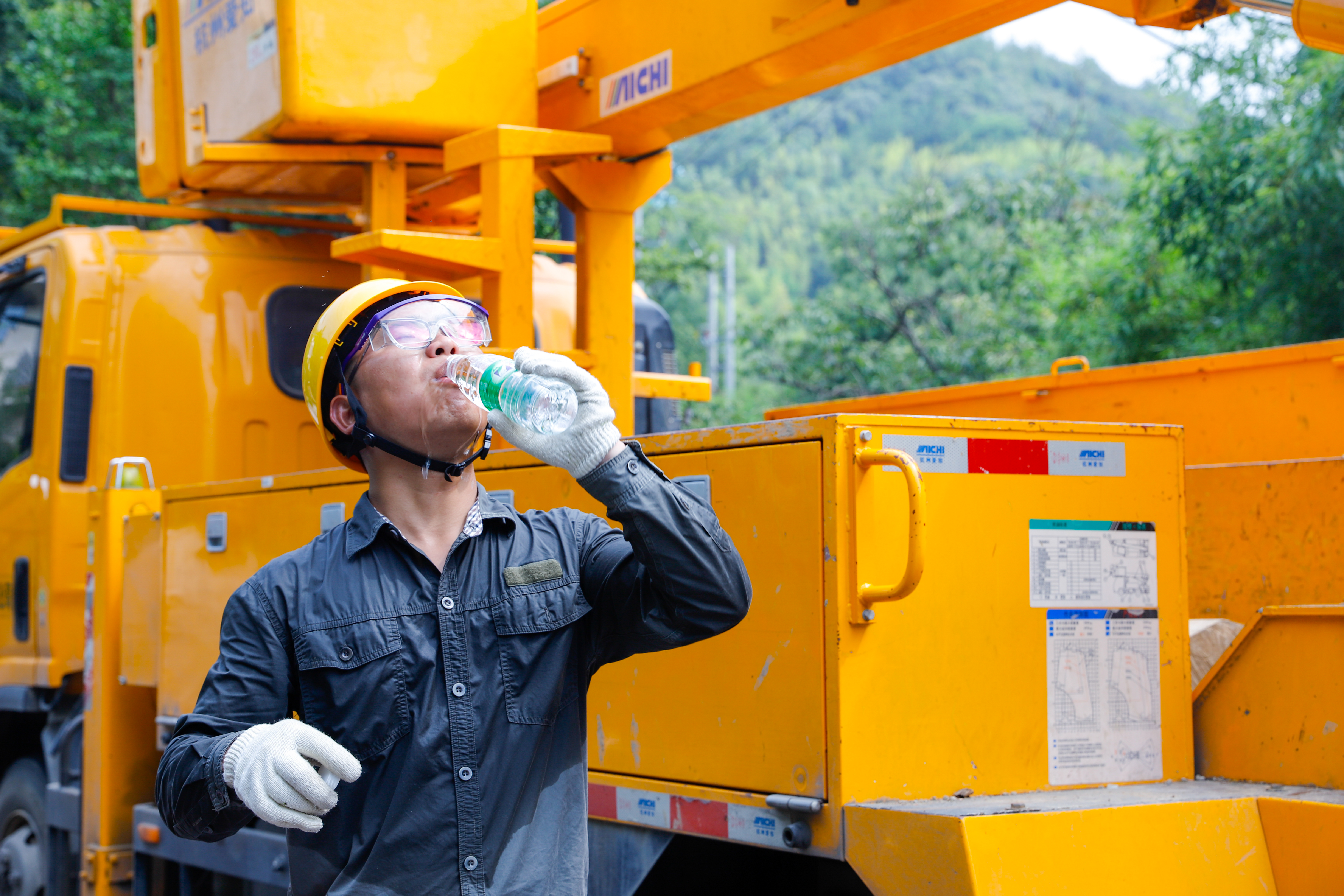隨著作業(yè)完成,作業(yè)斗緩緩落地。帶電作業(yè)人員卸下裝備,汗水像擰開的水龍頭一樣往下淌,長袖工服早已濕透貼在后背。他們摘下手套,抹了一把曬得通紅的臉,接過隊友遞來的水,一口氣灌了半瓶。