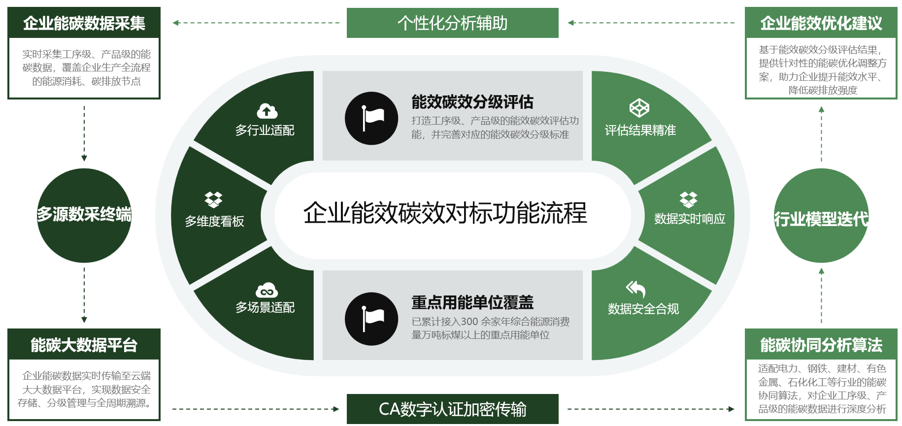 碳對(duì)標(biāo):已接入300余家年綜合能源消費(fèi)量萬(wàn)噸標(biāo)煤以上重點(diǎn)用能單位,聚焦電力、鋼鐵、建材、有色金屬、石化化工等行業(yè)能碳協(xié)同特性,打造工序級(jí)和產(chǎn)品級(jí)的能效碳效評(píng)估功能,完善相應(yīng)能效碳效分級(jí)標(biāo)準(zhǔn)。