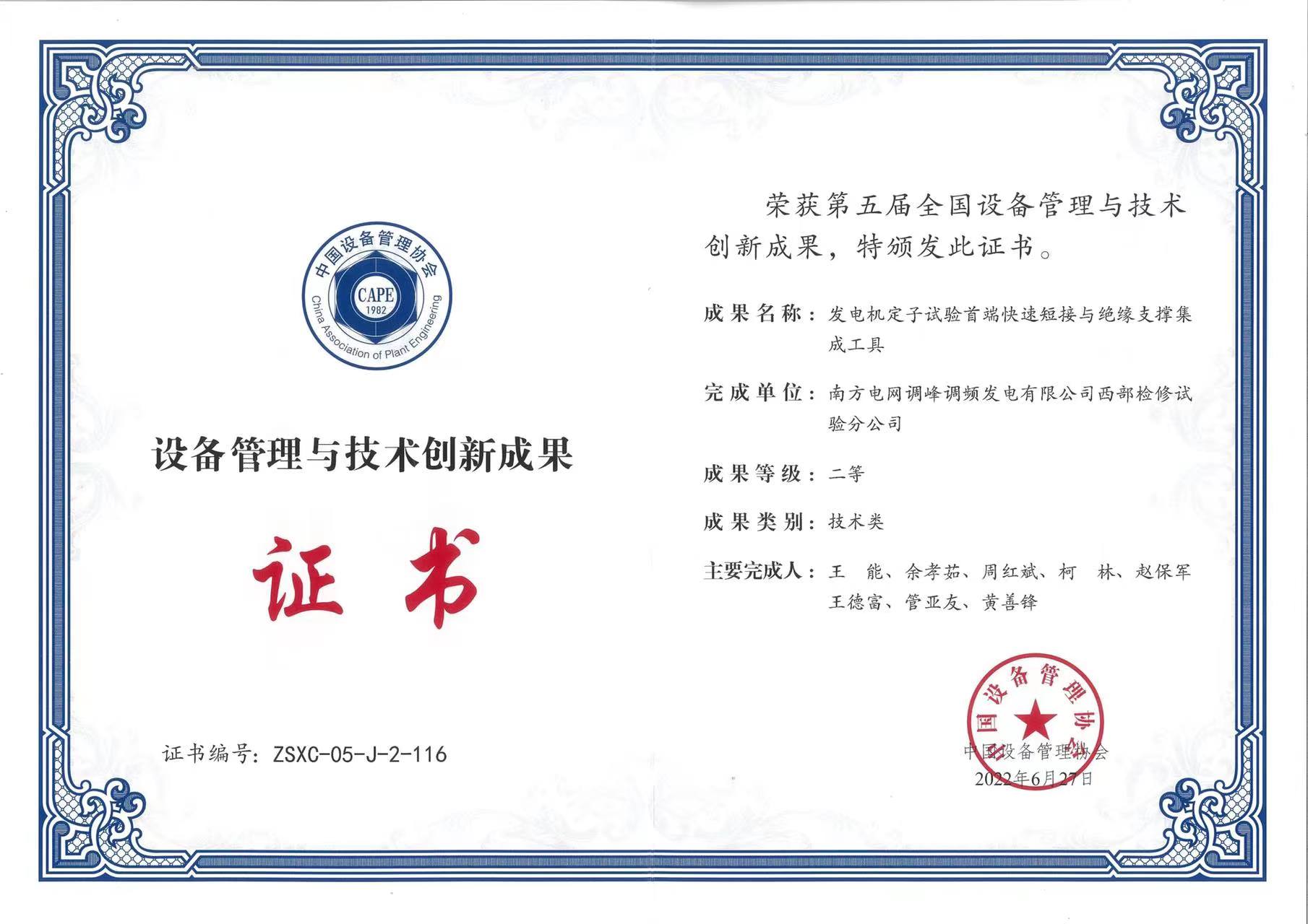 南方電網(wǎng)調(diào)峰調(diào)頻發(fā)電有限公司西部修試公司1項創(chuàng)新成果獲得中國設(shè)備管理協(xié)會二等獎