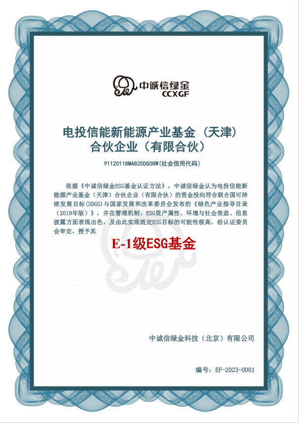 中國能源新聞網(wǎng)訊(阮捷竹 李鑫)自主題教育開展以來,國家電投集團(tuán)創(chuàng)新投資有限公司(以下簡稱創(chuàng)新投資)黨委聚焦“建新功”目標(biāo),部署了“ESG業(yè)務(wù)”專項(xiàng)行動(dòng)。日前,創(chuàng)新投資攜手中國信達(dá)資產(chǎn)管理股份有限公司發(fā)起設(shè)立電投信能50億元基金(以下簡稱電投信能基金)獲得ESG基金E-1等級(jí)認(rèn)證。